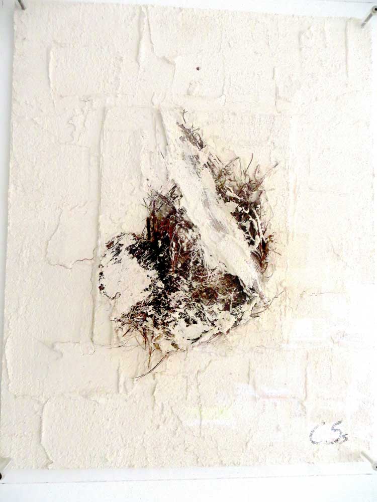 Célébrer la materia prima, intégrer dans l’œuvre le bois brut, les fragments de minéraux –cornaline, pyrite, mica, bois fossilisés de plusieurs millions d’années-, la paille de palmier et les sables blancs ou roses du Sahara…